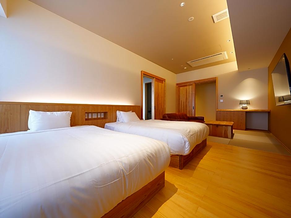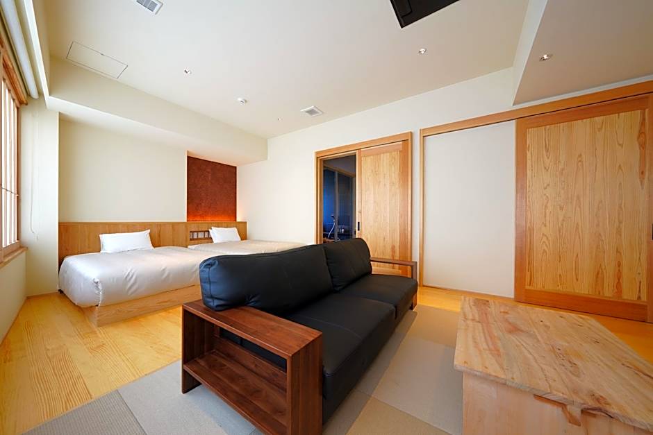 The private open-air bath is the standout feature of this twin room. The spacious twin room features air conditioning, a tea and coffee maker, as well as a private bathroom boasting a bath and a bidet. The unit has 2 beds.